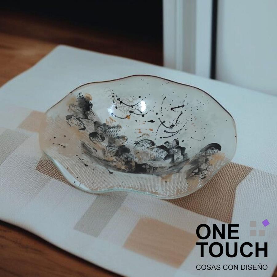 Pieza escultórica en vidrio float, de 36 cm de diámetro y 12 cm de altura, con un diseño curvo y sinuoso que fluye de manera orgánica. Su forma ondulante capta la luz y genera reflejos suaves, realzando la pureza del vidrio y la paleta mínima característica de ONE TOUCH.