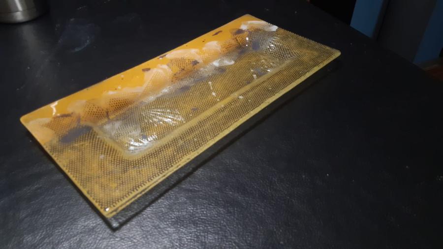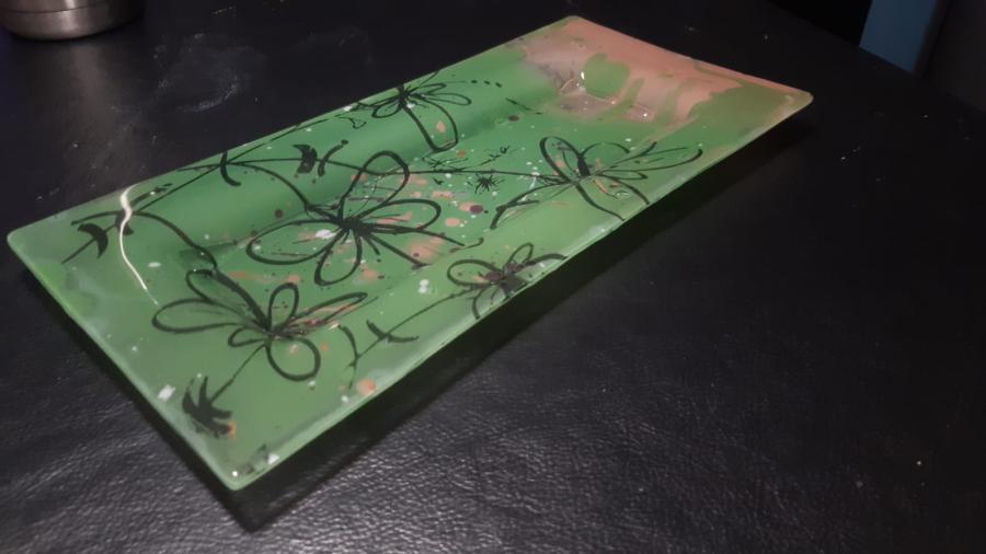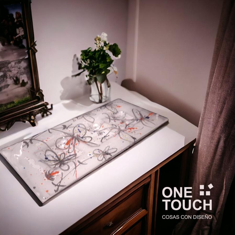 Cada pieza se trabaja a mano en vitrofusión, logrando una forma orgánica y equilibrada que permite presentar frutos secos, dips o pequeños bocados con estilo.