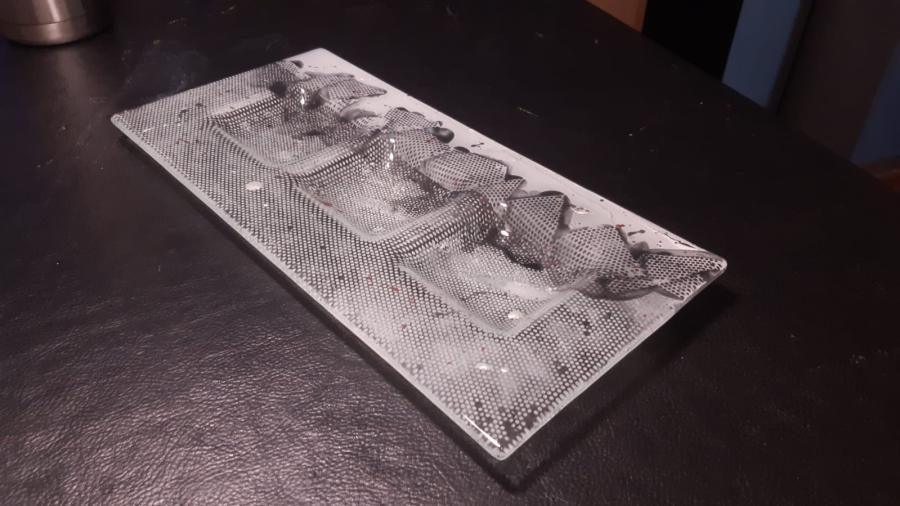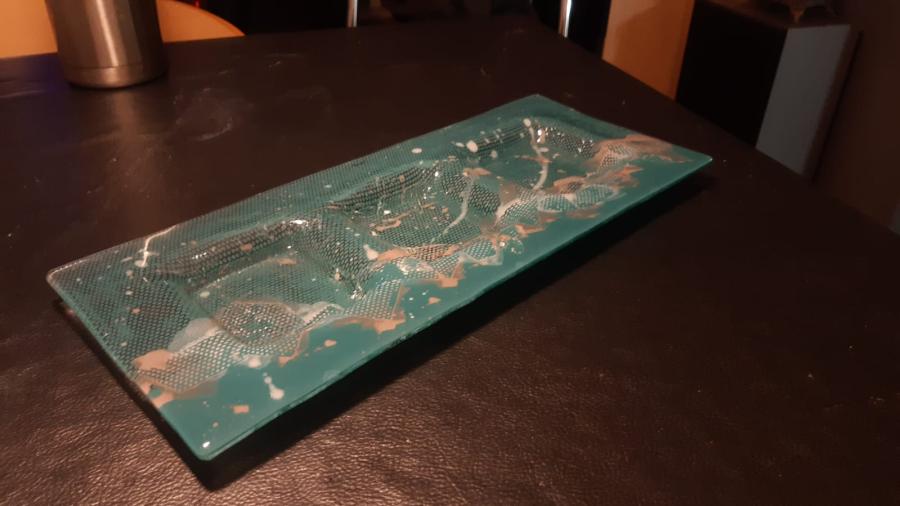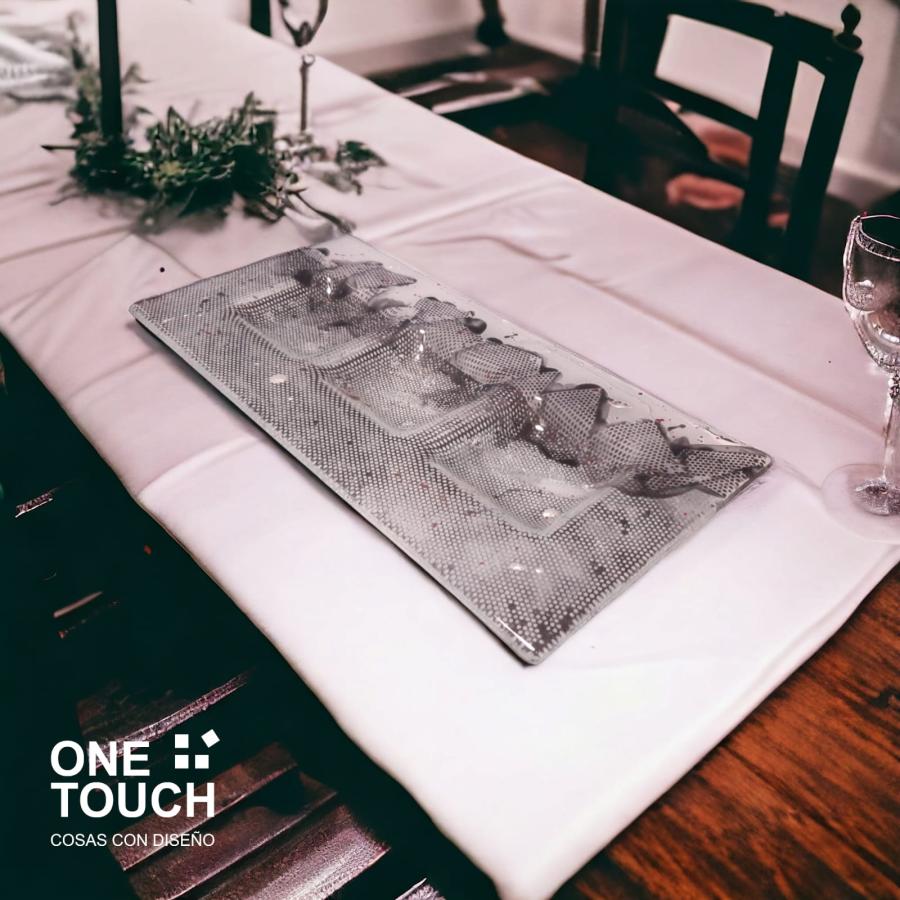 Cada pieza se trabaja a mano en vitrofusión, logrando una forma orgánica y equilibrada que permite presentar frutos secos, dips o pequeños bocados con estilo.