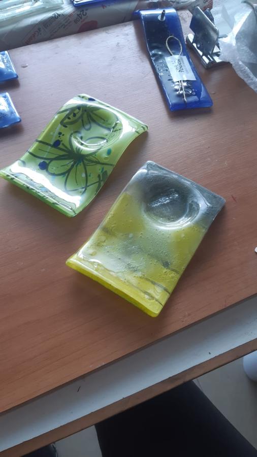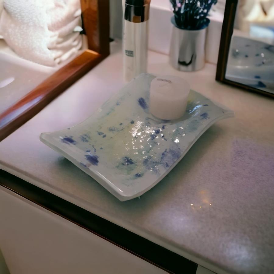 Portavelas de vitrofusión con un diseño artístico que combina transparencia y color en equilibrio. Cada pieza es elaborada a mano, logrando un objeto único que suma carácter y estilo al hogar